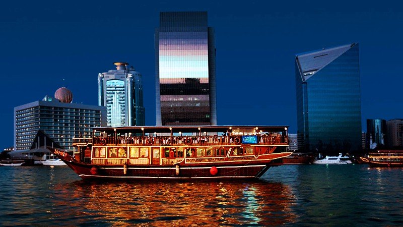 Later in the afternoon, prepare for a charming evening experience. You will be conveniently picked up from your hotel and transported to the historic Dubai Creek. Here, you will board a traditional wooden dhow for a delightful dinner cruise. As the dhow glides gently along the moonlit waters, you'll be treated to stunning views of the old and new Dubai skylines, including the beautifully illuminated souks and modern architectural marvels. A delicious buffet dinner, featuring a variety of local and international dishes, will be served onboard. To complete this enchanting evening, you will enjoy captivating entertainment, which often includes live traditional music and a mesmerising Tanura dance show, where a performer in a colourful, weighted skirt spins gracefully, creating a truly memorable cultural spectacle before you are returned to your hotel.