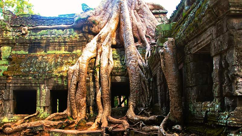 The tour concludes with a visit to the atmospheric Ta Prohm. This temple is an incredible sight, as it has been left largely in its natural state, with enormous fig trees and gigantic creepers embracing the stone foundations. The intertwining of man-made and natural elements gives the impression of a lost world being reclaimed by the powerful forces of nature.